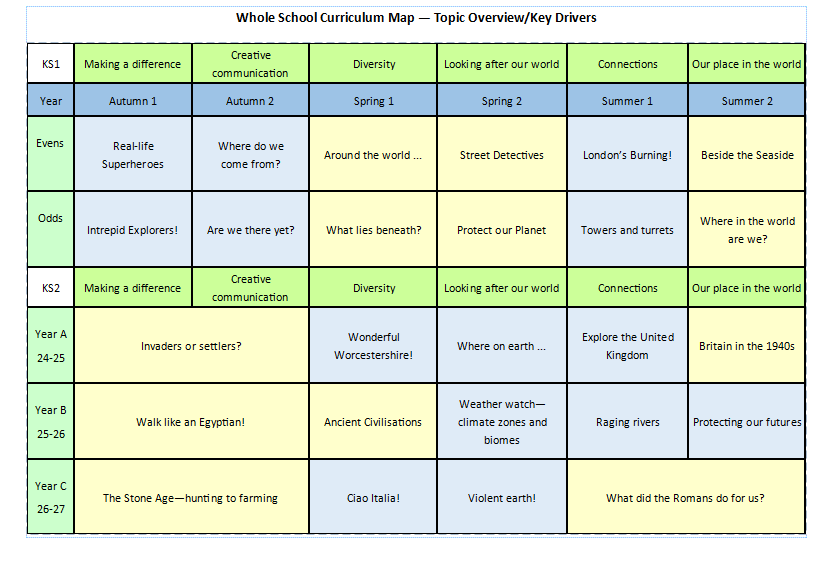 Here is an overview of our whole school Topic map with the associated Key Drivers (see below for more information.)