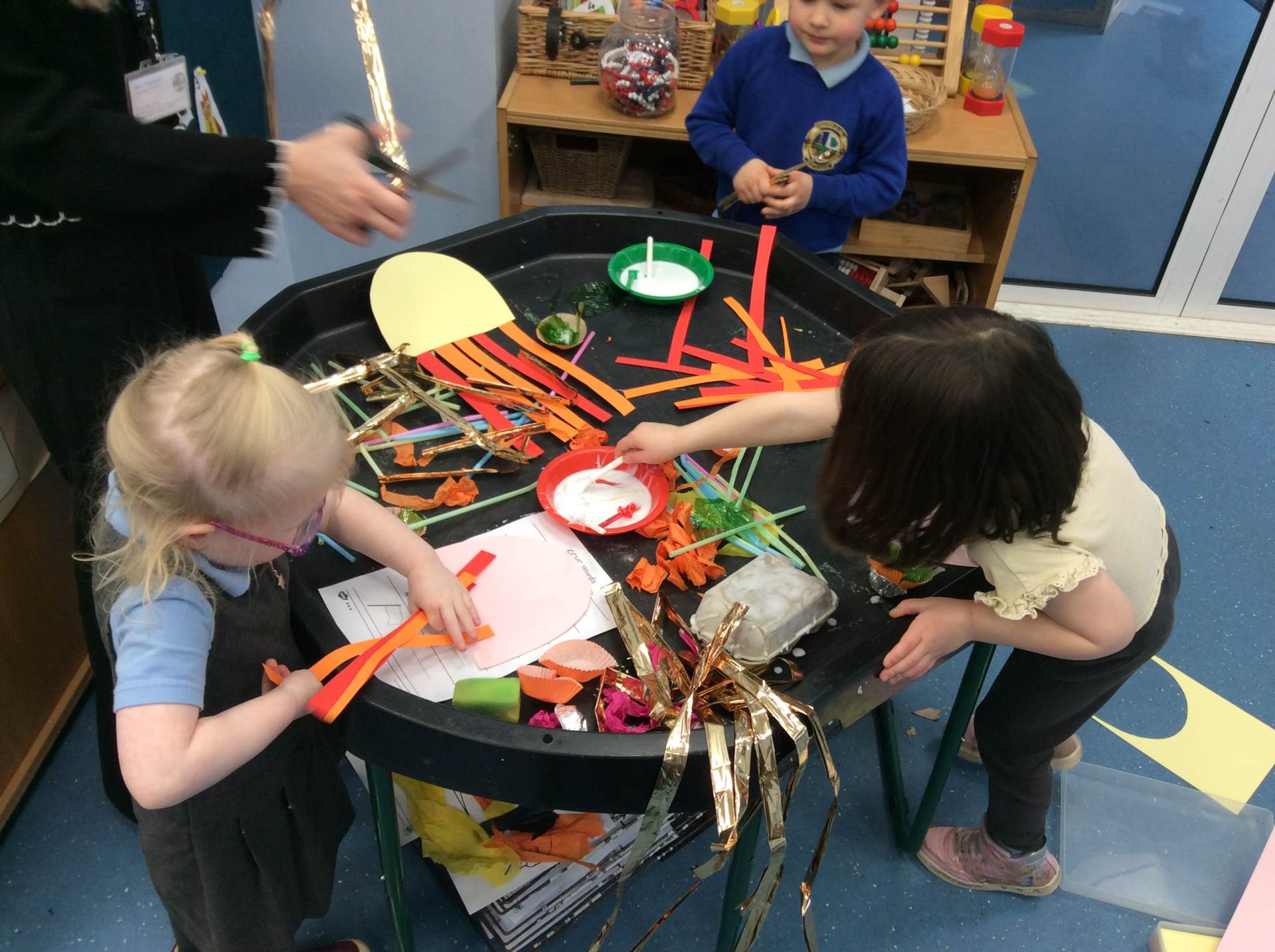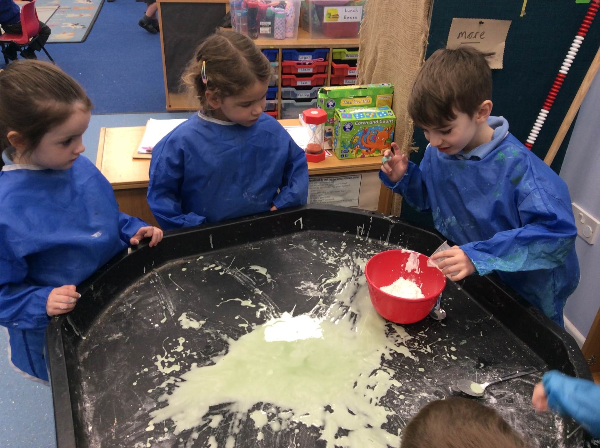When reading The Snail and the whale, we challenged the children to make snail slime by mixing cornflour, water and food colouring. This was a great collaborative activity that the children really enjoyed. The Acorn children worked on their mark making skills, making swirly snail trails using different resources and the Reception children were further challenged to write a message using the snail trail materials
