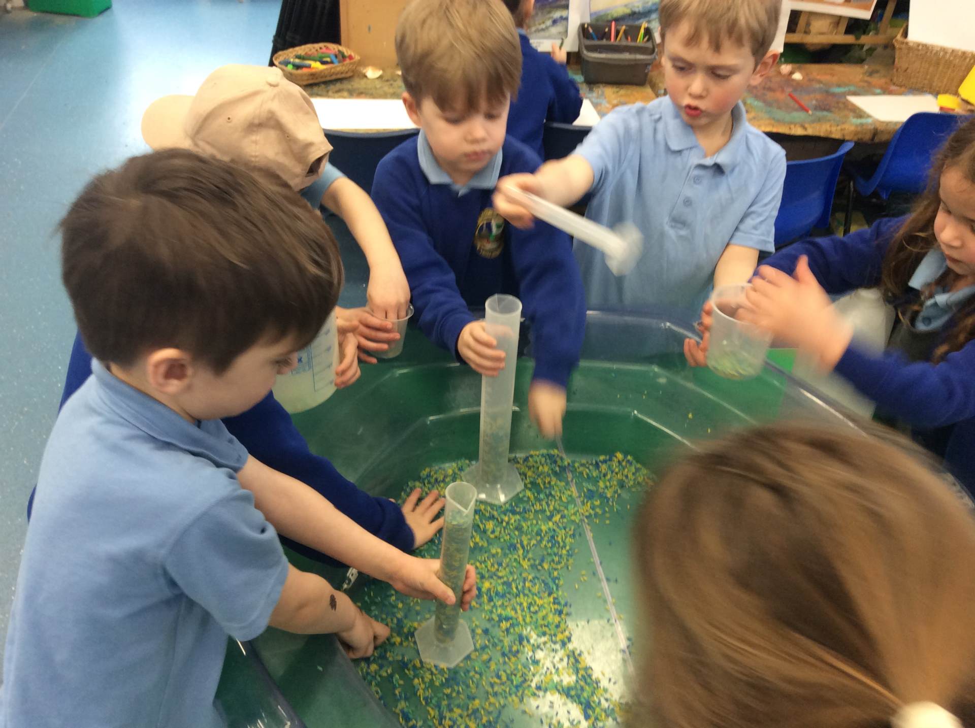 In Maths, the children have been exploring mass, weight and capacity. They have been observing what happens when different weighted objects are placed on the scales. Working in groups, the children were challenged to ‘balance’ the scales, inside and outside, using our large wooden scales. This activity was great for developing problem solving skills and perseverance. The reception children have also been really engaged in some capacity problem solving and comparing and ordering different containers using coloured rice to measure how much each can hold.